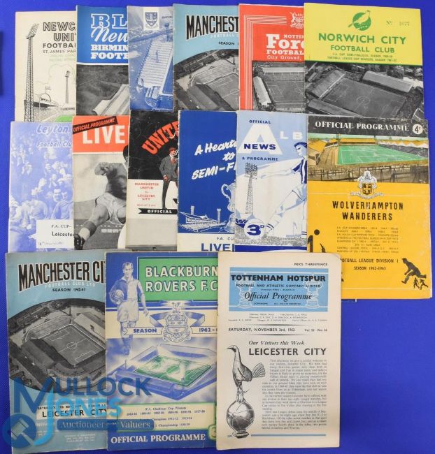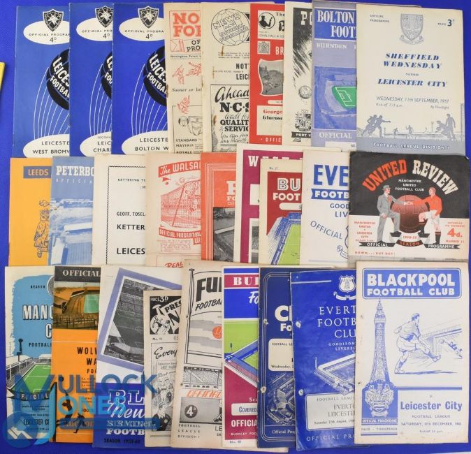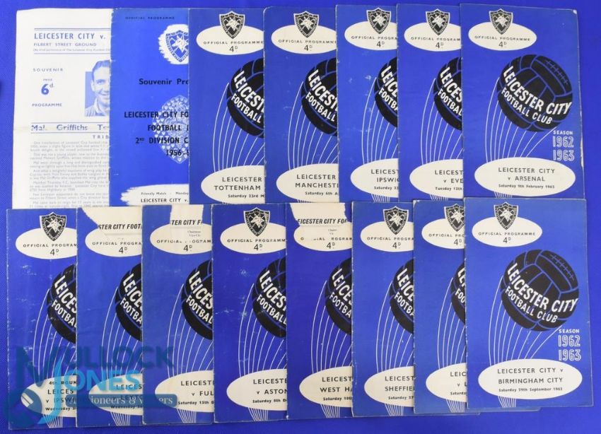 Collection of Leicester City match programmes homes 1956/57 Hibernian (friendly), International XI (Mal Griffiths testimonial), 1962/63 Spurs, Manchester City, Ipswich Town (FAC), Everton, Arsenal, Ipswich Town, Leyton Orient, Fulham, Aston Villa, WHU, Sheffield Utd, Liverpool, Birmingham City, WBA, Charlton Athletic (FLC), Bolton Wanderers; aways 1953/54 Nottingham Forest, Notts. County, 1956/57 Bristol City, Port Vale, 1957/58 Bolton Wanderers, 1957/58 Sheffield Wednesday, Leeds Utd, Peterborough Utd (friendly) (ph), Kettering Town (benefit match), Walsall (friendly), Nottingham Forest, 1958/59 WHU, Burnley, Everton, Manchester Utd, Manchester City, Luton Town, 1959/60 Wolves, Birmingham City, Spurs, Wrexham (FAC), Preston NE, Fulham, Burnley, Everton (ph), 1960/61 Blackpool (ph), Newcastle Utd, 1961/62 Birmingham City, Sheffield Wednesday, Manchester City (+ token sheet), 1962/63 Nottingham Forest, Norwich City (FAC), Leyton Orient (FAC), Liverpool, Manchester Utd, WBA, Wolves, Manchester City, Blackburn Rovers; fair at best. (58)
