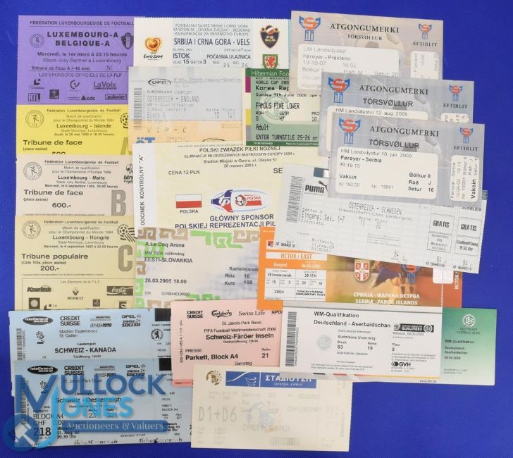 Tickets: Selection of tickets for international fixtures Luxembourg v Belgium(undated), 1994 Hungary, Iceland, 1995 Malta, 2002 Switzerland v Canada, Austria, 2003 Poland v Hungary, 2003 Serbia v Wales (2 April 2003 - postponed), 2004 Austria v England (corner tear upon entry), 2005 Estonia v Slovakia, 2006 Korea v Ghana, 2006 Switzerland v Faroe Islands, 2007 Faroe Islands v France, 2007 Cyprus v Slovakia, 2008 Serbia v Faroe Islands, 2009 Austria v Sweden, 2009 Faroe Islands v Serbia, 2009 Faroe Islands v France, 2009 Germany v Azerbaijan; fair/good. (19)