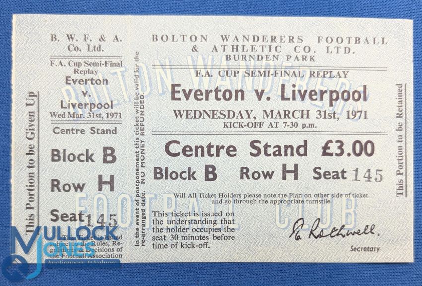 1971 FA Cup Semi-final Replay Football Ticket, Everton v Liverpool at Bolton Wanders - looking unused G+