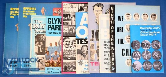Selection of Manchester City memorabilia to include 1967/68 We are the Champions 80 page magazine celebrating Div. 1 championship, 1973/74 City Supporters Official Handbook (98 pages), 1974 Texaco Cup programme covering Group 3 with City v Blackpool, City v Sheffield Utd (Denis Law final match), City v Oldham Athletic; has tear to back page with paper loss, The Texaco Cup Supporter 4 page edition, and player testimonial match programmes Roy Clarke, Glyn Pardoe, Ken Barnes, Alan Oakes, Johnny Hart, Tony Book; varied condition, overall fair. (A Lot)