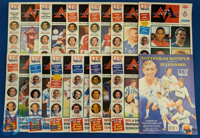 1991/92 ITV The Match - Live match official magazine No. 1 WHU v Liverpool 17 November 1991, Aston Villa v Leeds Utd 26 November 1991, Arsenal v Spurs 1 December 1991, Nottingham Forest v Arsenal 8 December 1991, Chelsea v Manchester Utd 15 December 1991, Liverpool v Arsenal 29 January 1992, Spurs v Feyenoord European Cup Winners Cup quarter final 18 March 1992, Sheffield Wednesday v Leeds Utd 12 January 1992, Everton v Nottingham Forest 19 January 1992,Everton v Leeds United 23 February 1992,Spurs v Nottingham Forest 1 March 1992, Manchester City v Southampton 15 March 1992, Arsenal v Leeds Utd 22 March 1992; generally good. (13)