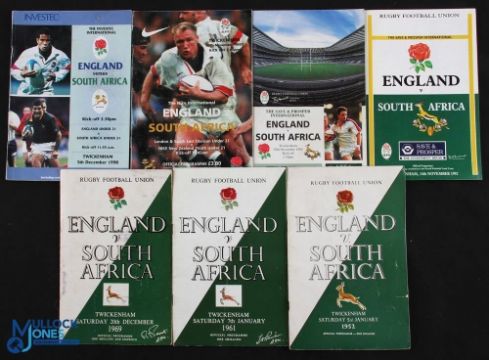1952-1998 England v S Africa Rugby Programmes (7): The Twickenham issues from 1952 (1st England magazine-style), 61, 69, 92, 95, 97 & 98. Generally, G/VG