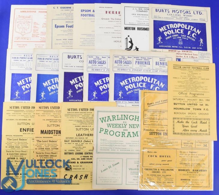 Selection of non-league match programmes Addlestone v 1962/63 Worcester Park, Epsom v 1950/51 Devas Institute (Surrey Snr Cup), Epsom & Ewell v 1962/63 Leatherhead, Horley v 1966/67 Woodmansterne, Merton Rushmere Utd 1966/67 v Egham Town, Metropolitan Police v 1958/59 Hertford Town, 1963/64 Crawley Town, Three Bridges (FAAC), 1965/66 Dartford, Dunstable, Stevenage Town; Sutton Town 1949/50 Hounslow Town (FAAC), 1951/52 Bromley, 1962/63 Enfield (London Snr Cup), Maidstone Utd (FAAC), 1966/67 Leatherhead (Surrey Snr Cup s/f); Warlingham FC v1950/51 Beddington Corner plus 'A' team v Tatsfield; fair/good. (17)