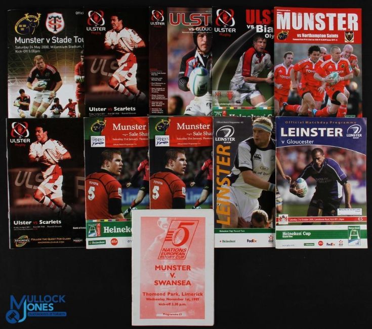 Irish Interest European Rugby Programmes (11): To inc 2008 Final, Munster v Toulouse, plus Leinster v Glos 2006 & v Wasps 2008; Munster v Swansea 1995 Sale (2) 2006 & v Northampton 2010; Ulster v Biarritz 2006, Glos 2007 & Scarlets (2) 2011. Thick glossies