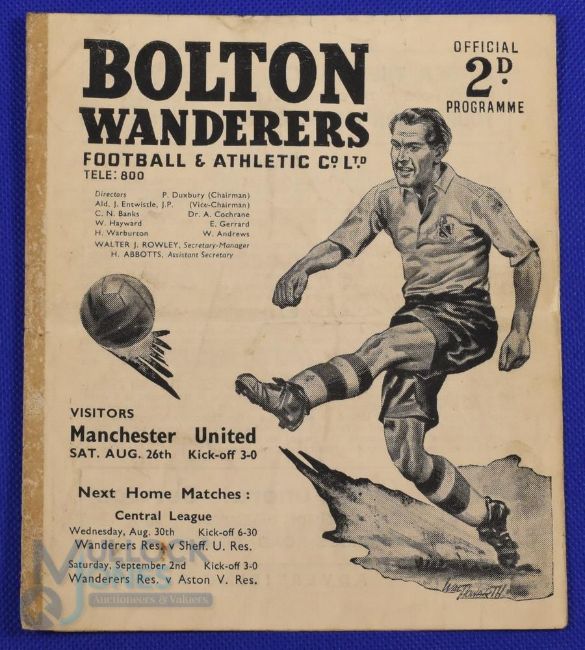 1950/51 Bolton Wanderers home match programme v Manchester Utd Div. 1 26 August 1950,3 team changes, Sellotape to page 1-2, overall fair. (1)