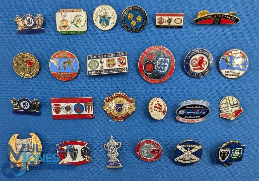 24x British Football Badges, metal and enamel Wimbledon, Crew, Chelsea, Bolton, Arsenal, Celtic, Bradford, Shrewsbury, Manchester United, Peterborough, Morton, Manchester City, Arsenal, Clyde, Preston