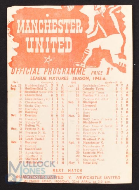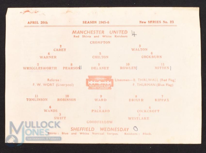 1945/46 Manchester Utd v Sheffield Wednesday War League 20 April 1946, single sheet; score penned in, fair. Been trimmed top and bottom (1)