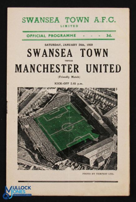 1959 Friendly match programme Swansea Town v Manchester Utd 24 January 1959 at Vetch Field, pocket fold, o/wise fair. (1)