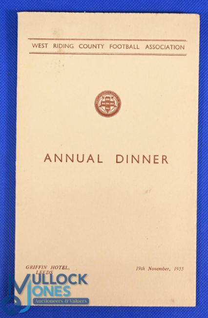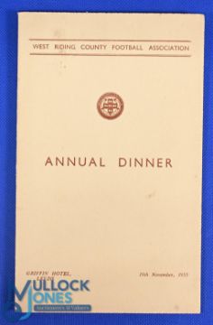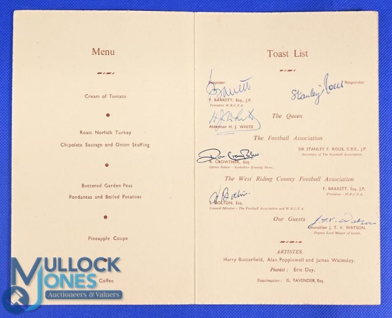 At Leeds: West Riding County Football Association Annual Dinner 19 November 1955 at the Griffin Hotel, Leeds 4 page card Menu & Toast List with signatures of the delegates to include Sir Stanley Rous (Football Association), F Barrett (WRCFA President), Alderman H J White, Ron Crowther (Sports Editor - Yorkshire Evening news), S Bolton (FA and WRCFA member) plus guest J T V Watson (Deputy Mayor of Leeds); fair/good. (1)