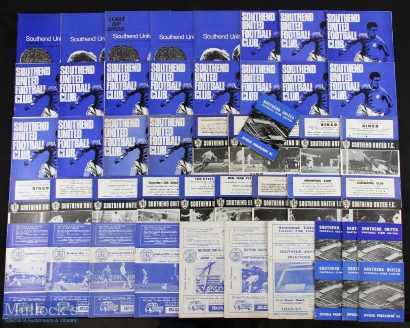 Collection of Southend Utd homes 1957/58 Brentford, 1962/63 Hull City, Wrexham, 1963/64 Barnsley, 1964/65 Colchester Utd, Exeter City, 1965/66 Utrecht SV Elinkwijk (friendly), York City, 1966/67 Gillingham (FLC), Barnsley, Stockport County, Tranmere Rovers, Chesterfield, Rochdale, 1967/68 Rochdale, Crewe Alex, Chesterfield, Workington, Darlington, Halifax Town, York City, Hartlepools Utd, Brentford, Bradford City, Barnsley, Exeter City, Darlington (FLC), Swansea Town, 1968/69 Halifax Town, Rochdale, Exeter City, Doncaster Rovers, Bradford City, York City, Peterborough Utd, Brentford, Colchester Utd, Port Vale, Chesterfield, Scunthorpe Utd, Bradford PA, Swansea Town, 1969/70 Swansea Town, Scunthorpe Utd, Brentford (FLC), Port Vale, Hartlepool Utd; fair. (47)