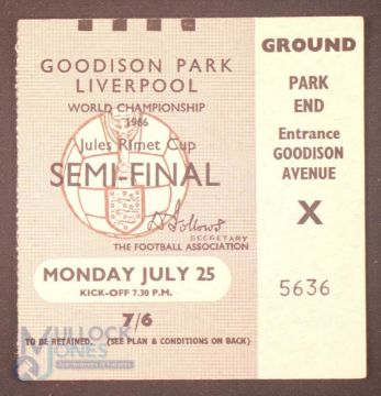 1966 World Cup Semi-Final Match Ticket West Germany v Soviet Union 25 July 1966 at Everton; fair/good. (1)