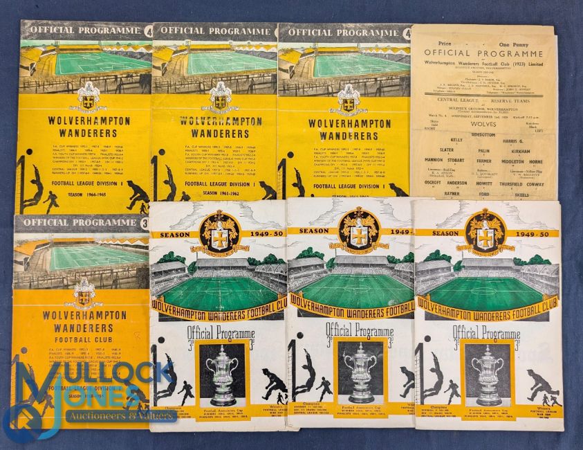 Wolverhampton Wanderers reserve home Football Programmes 1949-50 x3 (covers loose one missing page), 1958/59 x2 one a single sheet, 1961-62, x2 1964-65, fair (8)
