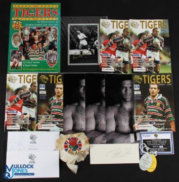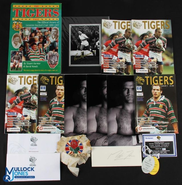 England/Leicester Tigers Signed Rugby Photographs, Programmes, Tickets, very worn England period rosette, and to include a Bill Beaumont signed photograph with COA by Up North, three Martin Johnson signed (beefcake!) photographs and car slip, five Leicester Tigers programmes, one with signatures, the Tigers' Club History, large Stuart Farmer h/b, club passes and a ticket. Good selection