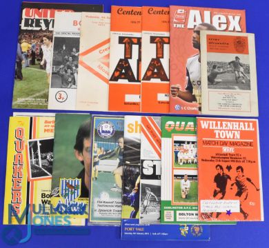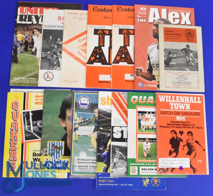 Selection of football programmes 1979/80 Manchester Utd v Bolton Wanderers (1st January 1980 postponed) plus single sheet insert, 1973/74 Scarborough v Crewe Alexandra (FAC replay), 1974 Crewe Alexandra v Moscow Torpedo (friendly), 1976/77 Crewe Alexandra v Darlington (13 November -postponed), 1976/77 Crewe Alexandra v Newport County (4 December - postponed), 2004/05 Crewe Alexandra v Burnley (26 December-postponed), 1967/68 Crewe Alexandra official handbook, 1977/78 Stoke City v Spurs, 1981 Willenham Town v Wolves (12 August friendly), 1986/87 Darlington v Bolton Wanderers (24 January 1987-postponed), 1985/86 Darlington v Bolton Wanderers (6 April 1986-postponed), 1985/86 Darlington v Bolton Wanderers single sheet insert 24 April 1986, 1981/82 WBA v Manchester Utd (28 December 1981-postponed), 2000/01 Braintree Town v Ipswich Town (testimonial) (28 March 2001-postponed), 2011/12 Shrewsbury Town v Port Vale (4 February 2012-postponed) + programme 27 March 2012 game played; good. (A Lot)