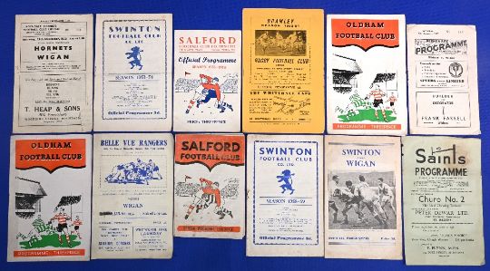 Wigan Rugby League FC away programmes 1952-1960 to include 52/53 Rochdale Hornets Oldham 53/54 Swinton Salford Bramley Wigan 54/55 Oldham Belle Vue Rangers 58/59 Salford Swinton 59/60 Swinton St Helens Mixed condition with some paper loss tears edge marks fold additional writing creases