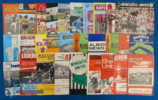 Collection of Manchester Utd away programmes 1954/55 Sheffield Utd (heavy ink stain to cover), 1958/59 Wolves (crease, corner tear), 1959/60 Manchester City, 1963/64 Blackpool, 1964/65 Blackpool, 1965/66 WBA (December-postponed), 1966/67 Sheffield Utd, Blackpool, Burnley, Liverpool, 1967/68 Sheffield Utd, Stoke City, Newcastle Utd, 1968/69 Stoke City, Watford (FAC), Liverpool, Chelsea, Leeds Utd, Birmingham City (FAC), 1969/70 Burnley, Watford (3rd/4th place) (crease), WBA, Ipswich Town (FAC), 1970/71 Aston Villa (FLC s/f), WBA, Nottingham Forest, WHU (nof), Stoke City, Liverpool, Manchester City 1971/72 Southampton (FAC), Chelsea, 1973/74 Chelsea, 1975/76 Leicester City (FAC), 1977/78 Nottingham Forest, Wolves, 1978/79 Arsenal, Nottingham Forest, 1979/80 Brighton, Spurs (FAC), 1983/84 Harrow Boro (friendly), Aston Villa, 1985/86 Sunderland (FAC), Newcastle Utd, Bishop Auckland (friendly), Bradford City (Bradford disaster appeal), 1986/87 Burnley (friendly), 1988/89 Coventry City, Sheffield Wednesday, 1989/90 Everton, Hereford Utd (FAC), 1990/91 Southampton (Rumbelows), Manchester City, Leeds Utd, 1991/92 Leeds Utd (FAC), 1993/94 Swindon Town (FAC), 1999/2000 Leicester City (special souvenir issue), Aston Villa (Worthington), Arsenal, Newcastle Utd; Fair. (60)