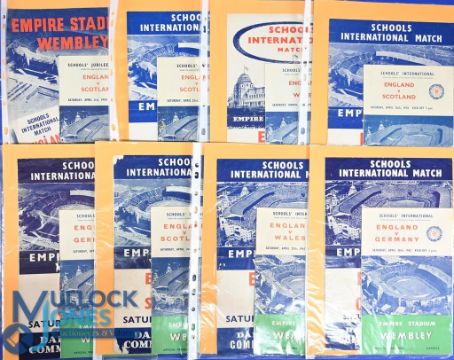 Collection of England international schools match programmes (plus community singing sheet with each programme) to include v 1954 Scotland, 1956 Scotland, 1957 Wales, 1958 Scotland, 1959 Germany, 1960 Scotland, 1961 Wales, 1962 Germany, 1963 Wales, 1964 Germany, 1965 Scotland, 1966 Germany, 1967 Scotland, 1968 Germany, 1969 Wales; also 1959 FAAC final programme Crook Town v Barnet; fair/good. (16)