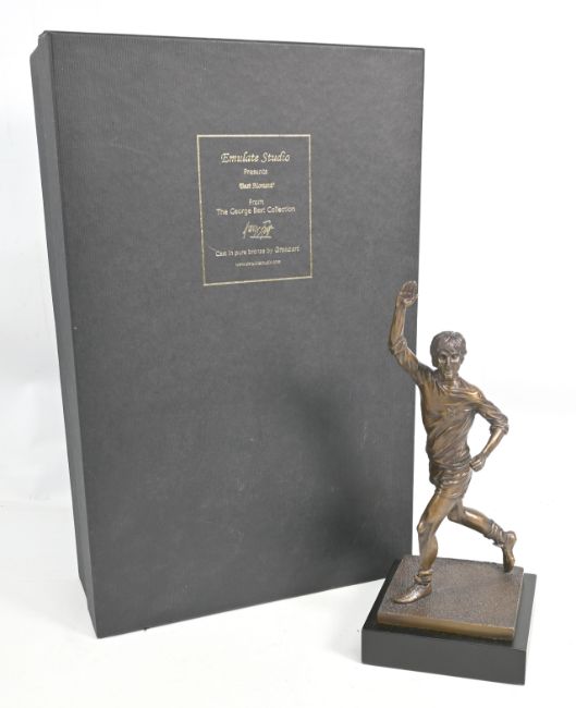 Bronze Figurine of George Best Titled "Best Moments" by Emulate Studio & £5 Note. A bronze figurine of George Best titled "Best Moments", by Emulate Studio, cast by Bronzart, from a limited this numbered 75/1968, height 30.5cm., 12in.; in original box of issue and complete with original COA and info leaflet from the casting 10 inches high figure on base