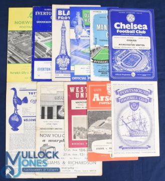 1958/59 Manchester Utd league programmes aways include Everton, Blackpool, Blackburn Rovers (2nd March), Manchester City, Chelsea, WHU (Bobby Moore debut match), Spurs, Arsenal, Portsmouth, Luton Town plus Norwich City (FAC); fair. (11)