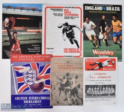 Assorted Football Programmes (6) features Testimonial Football Programmes to include Ray Clemence (Signed) 1980 Liverpool v RSC Anderlecht, Emlyn Hughes 1979 Liverpool v Borussia Monchengladbach, Bill Gates Testimonial 1974 Middlesbrough v Leeds United (poor), plus 1963 Amateur International Tournament, 1978 England v Brazil and 1962 Dukla Prague v Tottenham Hotspur - mixed A/G overall