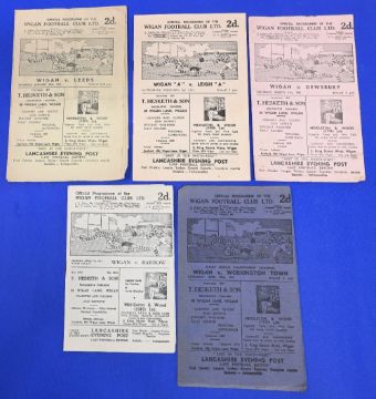 Five Wigan rugby league home programmes 1950-1951 to include Leeds Leigh 'A' Dewsbury Barrow Workington Town Fair-Good condition with some small paper loss worn edge marks additional writing fold creases trimmed edge