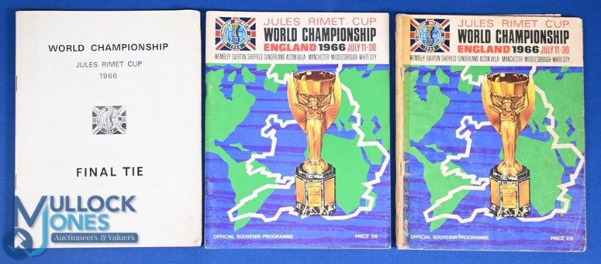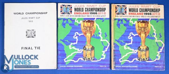 1966 World Cup Final match programme (lacking covers, teams filled in), 1966 World Cup tournament programme (good, no writing), 1966 World Cup tournament programme (scores filled in, Sellotape to spine); (3)