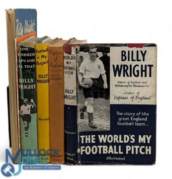 Billy Wright Wolverhampton Wanders and England Football Books, to include Billy Wrights Football Album Football Scrapbook P/B, One Hundred Caps and All That 1962 with D/J, Football Is My Passport 1957 with D/J, The Worlds My Football Pitch 1954 reprint with D/J, Captain of England 1950