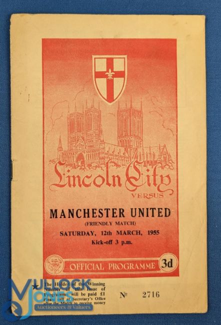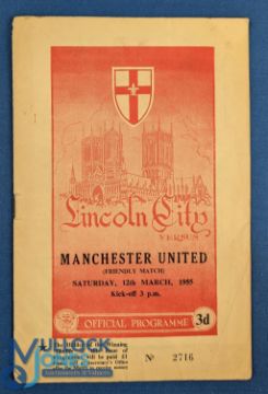 1954/55 Scarce friendly match programme Lincoln City v Manchester Utd at Sincil Bank 12 March 1955; small spine split, no writing, overall fair/good. (1)
