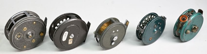 5x Various reels to incl' Intrepid Rimfly 3 5/8" alloy fly reel, a Roddy 31 Japan 3 ¼" alloy fly reel, an unnamed 3 1/8" alloy fly reel, a JW Youngs Beaudex 3 ¾" alloy reel with cracked rim and unnamed 3 ¼" alloy reel with counter balance - mixed condition