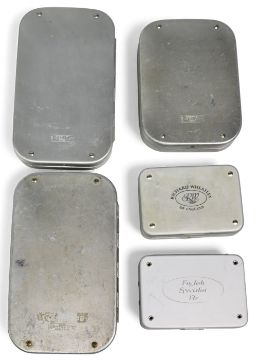 Quality collection of Wheatley alloy fly tins with a huge collection of flies, as follows: Top Pocket 3 ½" x 2 ½" with swing leaf, 60 small and 42 medium clips with 100 wet trout flies. Top Pocket 3 ½" x 2 ½" 20 clips and foam with 20 wet and 15 dry trout flies. Slim Alloy 5" x 3 ½" with swing leaf, 100 small and 70 medium clips with 170 wet sea trout and trout flies. Slim Alloy 6" x 3 ½" with swing leaf, 140 small and 98 medium with 230 trout flies. Slim Alloy 5" x 3 ½" with 70 small and 49 medium and 139 trout flies. Fantastic