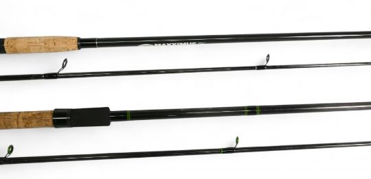 Fladen Maxximus Rockfisher 11ft 2 piece woven graphite spinning rod, casting weight 20-50 grams, down lock screw reel fitting and cork handle, good in MOB, and a similar Kunnan graphite spinning rod 10-40 grams, in MOB. (2)
