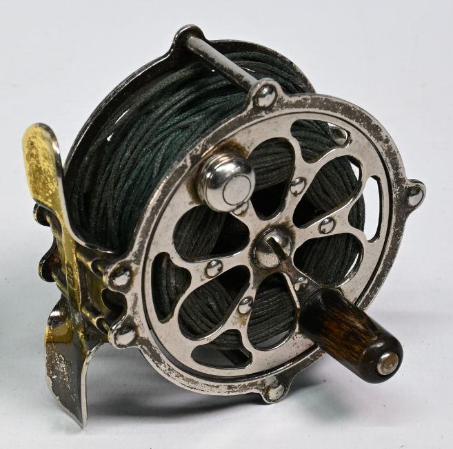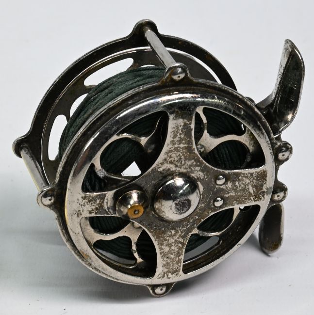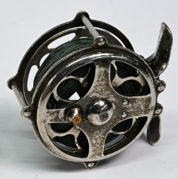 Pfleuger USA Progress 80 polished skeleton reel, 2 ½" spool with counter balanced handle, exposed pillars, on/off check. Runs very well