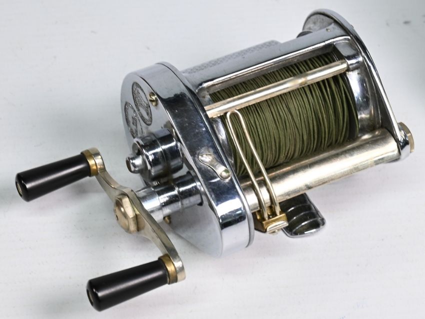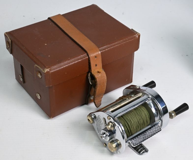 Hardy Bros "The Elarex" bait casting reel, chrome plated on/off check and side tensioner, twin handles, level wind with maintenance instructions, cloth pouch and rexin case. Light use, runs smooth