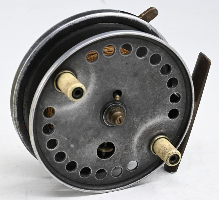 Scarce Holbrow & Co, 40 Duke Street, London, alloy centre pin/trotting reel, 3 ½" ventilated spool with milled rim face tensioner and latch on 4 spoke frame, twin xylonite handles, brass rim mounted on/off check. Wear for age, runs very well