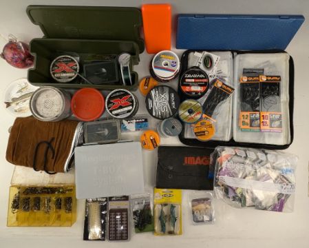 Assorted Fishing Tackle and Accessories, to incl hooks, a wallet with a quantity of used Gru hair rigs hooks, Browning rigs, Ridge monkey box with bait cages, tools, shot, camo running rig, bait tins, a cloth rod bag, glass fish and two small fish pin dishes, (box)