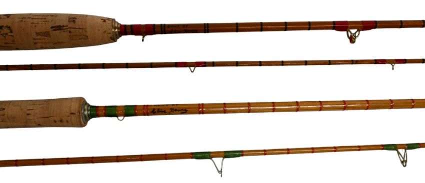 A fine and interesting pair of split cane rods in a presentation walnut case. Rods made by Clive Young "The Miracle" and "The Bourne". Both 4ft 2pc with cloth bags. Superb