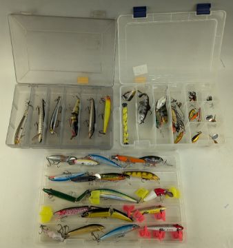 Collection of plastic single and jointed lures up to 14cm, makers include Rapala, Abu, Heddon, Mepps, and small number of Mepps spinners, all in 3 boxes