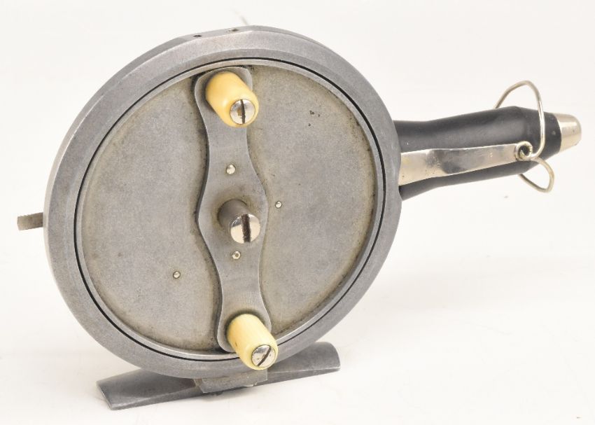 Illingworth No.1 Patent casting reel, No. 406, backplate stamped Oil me please, reciprocating wooden spool, 2 wire flier, twin white handles, alloy foot, threaded holes to backplate, reel operates well, comes in maker's red velvet lined hinged lid case, with Illingworth paper