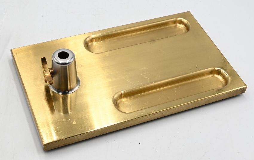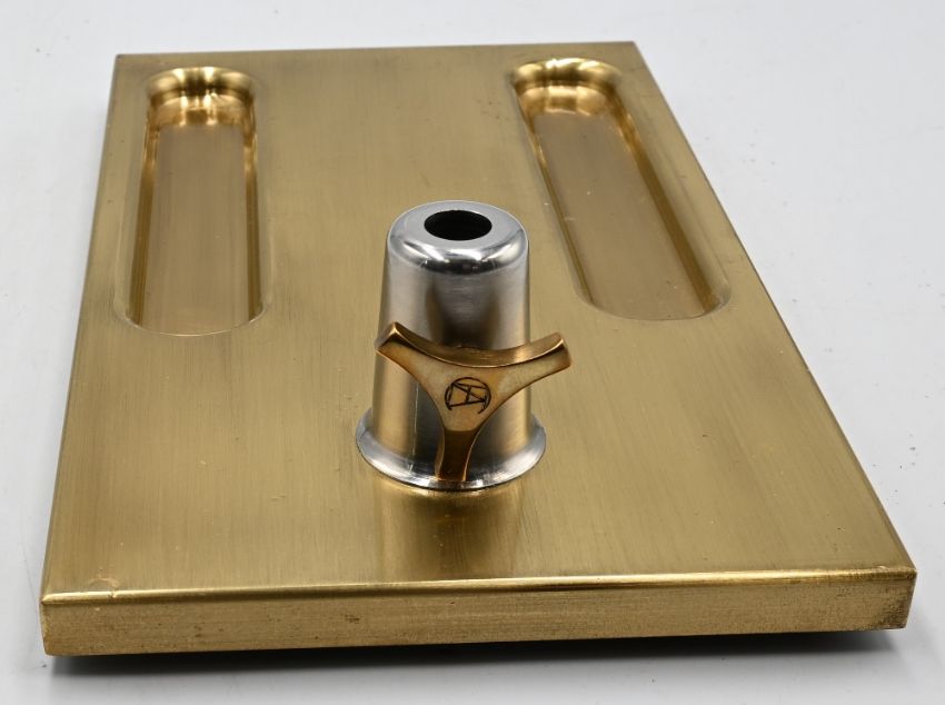 Polished brass Exhibition vice Pedestal - 8x4 ¾" with polished steel riser and brass locking star wheel with twin hook/ bead slots with non slip base studs