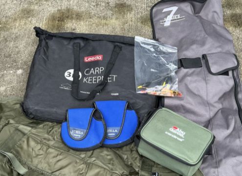 Fishing Tackle Bags Accessories, to include rod bags Stella reel case, Abu reel case, padded Gardner catch bag, 7 series 6 tube holder, and a Leeda Carp keep net 3m, and a small collection of tradition quill floats by Cotton