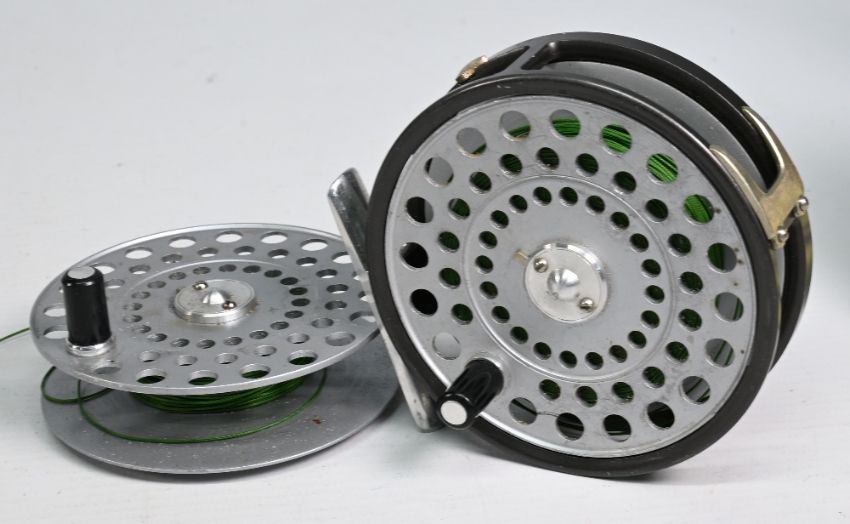 Hardy Bros "The Princess" alloy trout fly reel with spare spool, 3 ½" ventilated spool, 2 screw latch, black handle, milled rim tensioner, constant check, 2 screw 'U' shaped line guide and smooth alloy foot. Very light use, runs well