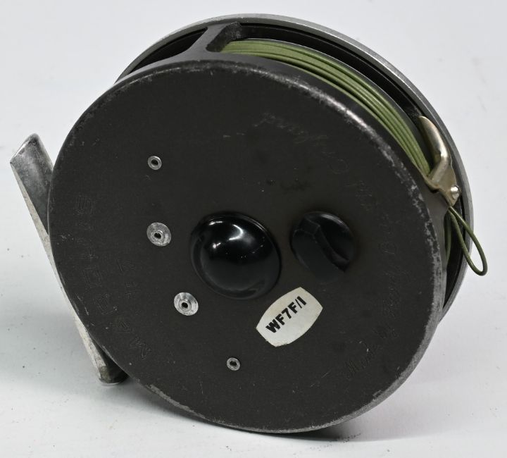 Hardy Bros Marquis 7 multiplier alloy trout fly reel, 3 7/16" ventilated spool, 2 screw latch, black handle, rear tensioner, 'U' shaped alloy line guide and foot. Light rim wear, MZC, runs well