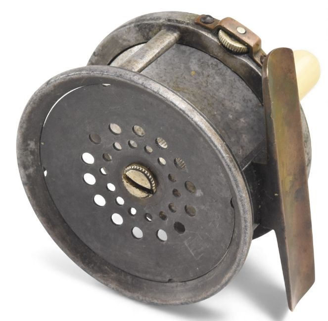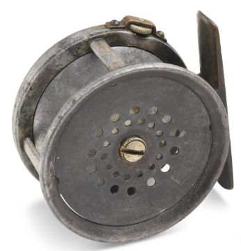 Hardy 2 ½" alloy Houghton wide drum fly reel white handle, dished faceplate with original drum screw, strapped tension regulator, blue steel calliper check, complete ball bearing set, faceplate stamped with open oval & straight line trademarks, good original finish, in later Hardy zip reel case.