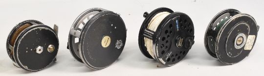 4x Various reels - to inc Ryobi 455 magnesium fly reel 4" rim tensioner, constant check, Shakespeare geared fly reel OMNIX 7/8 alloy fly reel, rear tensioner, DAM Berlin alloy trout fly reel 3 ½" with on/off check and Intrepid Rimfly 3 ½" constant check - varied condition