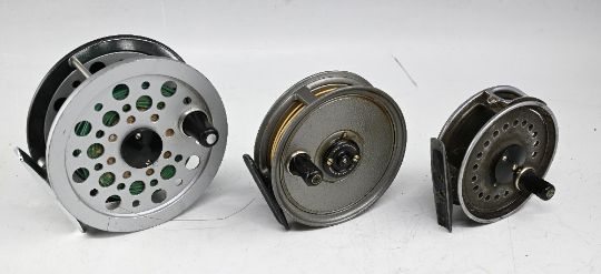 Early J W Young & Sons Patent Beaudex fly reel, 3" diameter with lead finish, backplate drag adjuster, a grey finish 3 ½" Pridex in good condition and a Shakespeare Beaulite by Young's 4 ¼" wide drum salmon fly reel, adjustable brake and sinking line. (3)