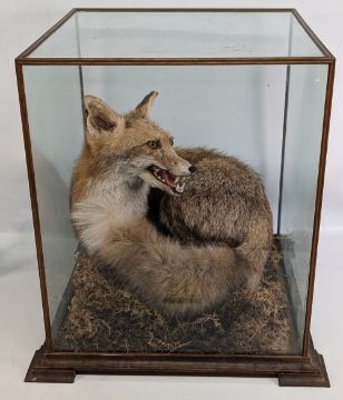 Taxidermy: Cased Fox by N Dewhurst Shropshire, large fox at rest, well modelled with mouth open, on natural moss, in a cube style glass case with oak frame - size 55cm x 52cm x 52cm