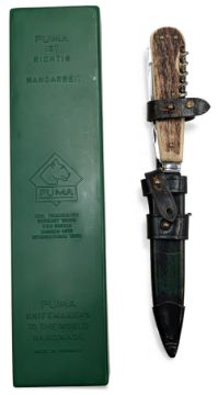 A Puma Werk original Waidmeller Hunting Knife 3591, with 2 extra blades and corkscrew set in an antler handle, 8.5' long, in a leather sheath. Over 18 collection or age verification postage UK only