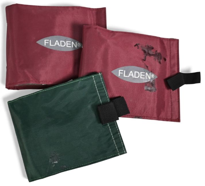 Fladen nylon 10 sleeve leader pack, 8" x 6 ½" with Velcro close, containing 13 large poppers. Fladen nylon 10 sleeve leader pack, 8" x 6 ½" with Velcro close, containing 29 salt water pike flies. Unnamed nylon 10 sleeve leader pack, containing 34 large salt water pike flies. (3)