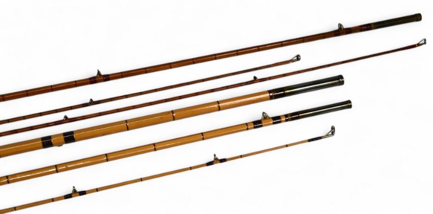 Aspindales Redditch "The Perfection" No 928 split cane trout fly rod, 9ft 2pc with spare tip (note tips 1" and 7" short), alloy uplocking reel seat and collar, red agate butt/tip rings, cloth bag. Mitre Hardy "The Dunkeld" salmon split cane fly rod 12ft 3pc line 8#, 21" handle, alloy sliding reel fittings and collar, clear agate butt/tip rings, cloth bag. Looks refurbished, light use. (2)