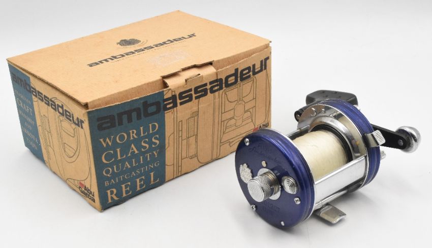 ABU Ambassadeur 6500C3CT Elite multiplier reel in blue finish foot stamped 050005, open frame, star drag, on/off switch, counter balance handle, comes in maker's card box